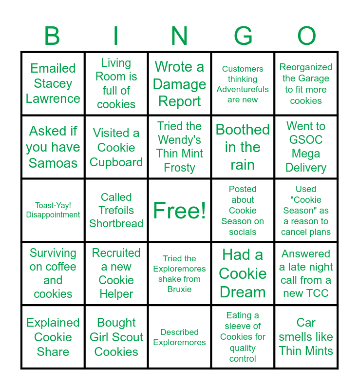 This bingo card has a free space and 28 words: Answered a late night call from a new TCC, Sent husband to the Cookie Cupboard, Boothed in the rain, Eating a sleeve of Cookies for quality control, Asked if you have Samoas, Wrote a Damage Report, Living Room is full of cookies, Surviving on coffee and cookies, Posted about Cookie Season on socials, Explained Cookie Share, Toast-Yay! Disappointment, Customers thinking Adventurefuls are new, Bought Girl Scout Cookies, Described Exploremores, Went to GSOC Mega Delivery, Went to Cookie Kickoff, Recruited a new Cookie Helper, Visited a Cookie Cupboard, Tried the Wendy's Thin Mint Frosty, Tried the Exploremores shake from Bruxie, Emailed Stacey Lawrence, SU Meeting runs over time, Car smells like Thin Mints, Called Trefoils Shortbread, Used "Cookie Season" as a reason to cancel plans, Had a Cookie Dream, Reorganized the Garage to fit more cookies and Found a cookie in your purse.