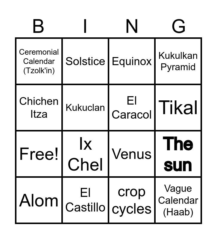 This bingo card has 20 words: The sun, The Moon, Equinox, Itzamna, Alom, Chichen Itza, El Castillo, Ceremonial Calendar (Tzolk'in), Free!, Solstice, Ix Chel, Venus, Kukuclan, Vague Calendar (Haab), El Caracol, Chaac, Tikal, Kukulkan Pyramid, crop cycles and eclipse.