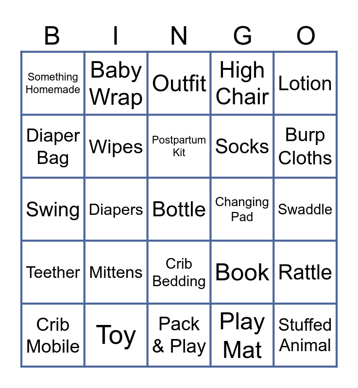 This bingo card has 40 words: Bibs, Diapers, Blanket, Book, Stuffed Animal, Swing, Wipes, Pacifier, Socks, Rattle, Something Homemade, Baby Wrap, Bottle, Play Mat, Swaddle, Diaper Bag, Booties, Outfit, Towel, Lotion, Teether, Toy, Postpartum Kit, Changing Pad, Nursery Decor, Organizer, Car Accessory, Baby Monitor, Furniture, Nursing Pillow, Bodysuits, Mittens, Crib Bedding, Grooming item, Burp Cloths, Crib Mobile, Stroller Accessory, Pack & Play, High Chair and Bath toy.