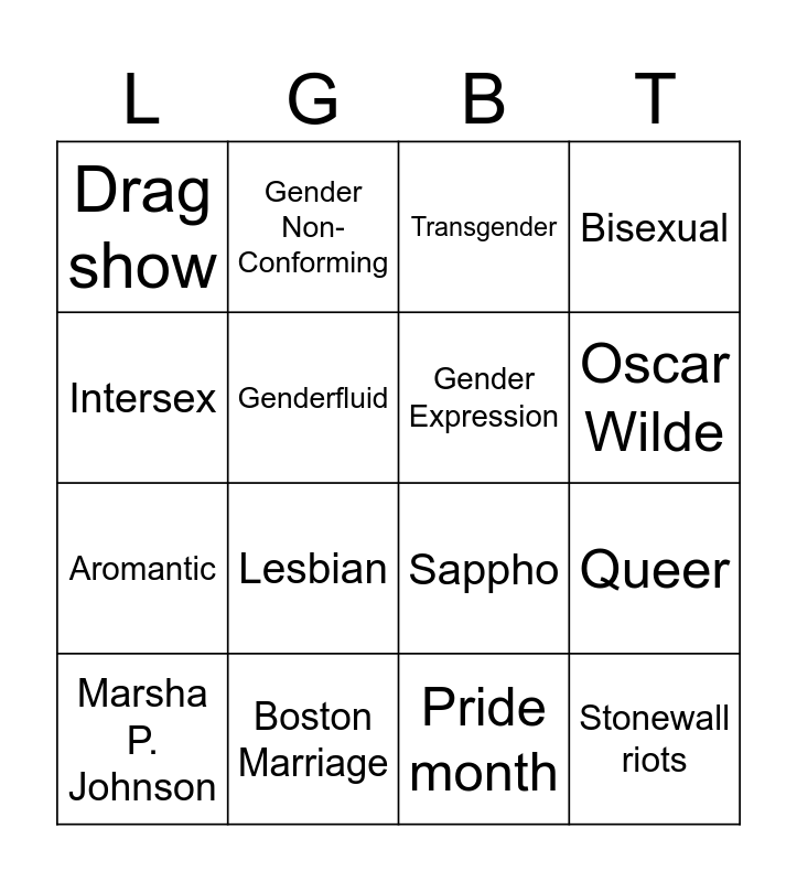 This bingo card has 18 words: Lesbian, Stonewall riots, Transgender, Drag show, Sappho, Bisexual, Marsha P. Johnson, Gender Non-Conforming, Oscar Wilde, Aromantic, Pride month, Intersex, Queer, Genderfluid, Gender Expression, Green carnations, Boston Marriage and Femme.