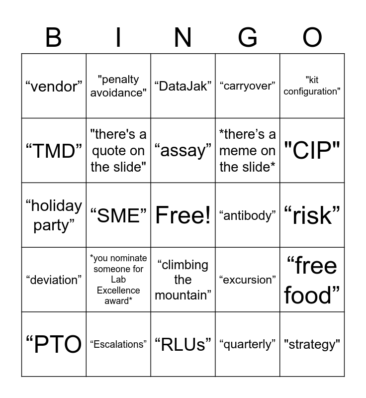 This bingo card has a free space and 169 words: “feasibility”, “next year”, “QN”, “R&R”, “holiday party”, “AIM”, “promotor”, "shout out", *there’s a picture of you on the slide*, “new hire”, “OpEx”, “Quest”, “assay”, “D2”, "strategy", "nominate", "we have a lot to get through", “merit”, “culture”, “M320”, “SQDIP”, “Peakon”, “best practice”, “Spotlight”, “next month”, “CoPilot”, “Instrument”, “job role”, “ETQ”, “safety”, “China”, "Stretching", "there's a quote on the slide", “docking station”, “RLUs”, “ACI”, “CP”, “elevating”, “catalog”, “open overdue orders”, “engagement”, “Azure DevOps”, “PTO, “backorder”, “computers”, *there’s a cartoon on the slide*, "complaint", “clean up”, “SME”, “healthcare”, “PMA”, "reference range", “carryover”, “Healthineers”, “site closure”, *TOC presenters/Jim makes someone stand up*, *you participate in stretching*, *you nominate someone for Lab Excellence award*, "non-communicable diseases", “Tech Transfer”, “antibody”, "OLDP", “Andrea”, *you submit a question for Jim*, “oncology”, “agenda”, *technical difficulties with the slides*, “training”, “reward”, “risk”, *there is a typo on the slide*, *Presentation ends early*, “volunteer”, “curricula”, “hepatitis”, “CRM”, "particle development", “scrap”, “OneSRM”, "relaunch", "drift", “2026”, "hydra", "DHF", “SAP”, “Get Access”, “Lab Excellence”, “aggregation”, “Escalations”, “New Ambition”, “Walk-In”, “Happy Wednesday”, *someone is clicking a pen*, “mutual expectations”, "CIP", "penalty avoidance", “climbing the mountain”, “biochemist”, “ERG”, “Swords”, “manager”, “hot zone”, *microphone isn’t working*, “ambition”, “free food”, “lab administration”, “CSS”, “action item”, “TMD”, “dilution”, “lunch”, “deviation”, “My Cority”, “DataJak”, “implementation”, “cafe coupon”, “bonus”, "Thyroid", "kit configuration", "techniTidy”, “Manufacturing”, “SPS”, “business continuity”, “plasma”, “Quality Control”, "efficiency", “Leankit”, “benchmark”, “investigation”, “service anniversary”, “Magnets”, “vendor”, *antigen”, "congratulations", "demand", "technical operations", “Freezer”, “OEM”, “Cardio”, “all hands on deck”, “quarterly”, “Glasgow”, “Teams”, “timeline”, *there’s a meme on the slide*, “Centaur”, “BSA”, “learning opportunity”, “troubleshooting”, "Architecture", “Productivity”, “project”, “R&D”, “lean”, “audit”, “excursion”, "5S", “LMLS”, “benefits enrollment”, “participation”, “Walpole”, “manufacturing support”, “510k”, “AI”, “hopper”, “batch record”, “customer”, “data” and “Kaizen”.