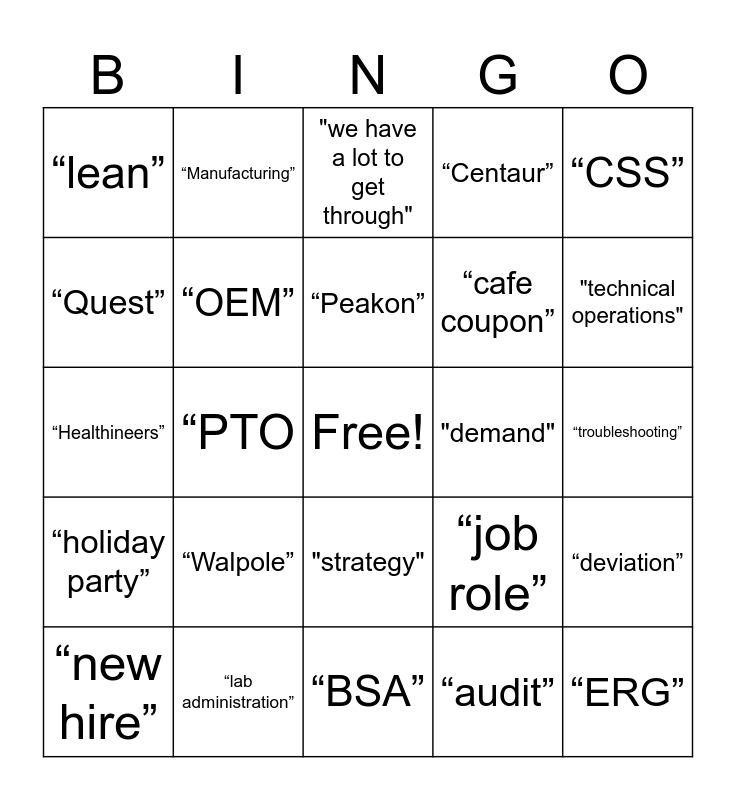 This bingo card has a free space and 169 words: *you submit a question for Jim*, “SAP”, “free food”, “manufacturing support”, “Healthineers”, “safety”, “scrap”, “DataJak”, "OLDP", “Swords”, “2026”, “Productivity”, “Peakon”, “benchmark”, “ERG”, “Spotlight”, “agenda”, “oncology”, *someone is clicking a pen*, *there’s a cartoon on the slide*, “D2”, “elevating”, “project”, “Walk-In”, “Cardio”, “Escalations”, “docking station”, "drift", “action item”, “Happy Wednesday”, "complaint", “all hands on deck”, “OEM”, "relaunch", “BSA”, “catalog”, “merit”, “carryover”, “Tech Transfer”, “clean up”, “SME”, “quarterly”, “new hire”, “participation”, “Freezer”, “investigation”, *Presentation ends early*, "reference range", “PTO, “next year”, “benefits enrollment”, "there's a quote on the slide", “Centaur”, “AI”, “healthcare”, “feasibility”, *you nominate someone for Lab Excellence award*, “Walpole”, “Quality Control”, “SQDIP”, "demand", “PMA”, “service anniversary”, "nominate", "DHF", “timeline”, “hopper”, "kit configuration", “site closure”, “troubleshooting”, “backorder”, "efficiency", “open overdue orders”, “antibody”, "particle development", *microphone isn’t working*, “next month”, “excursion”, “R&D”, “reward”, “QN”, “OneSRM”, “Leankit”, “training”, "penalty avoidance", “Magnets”, “ACI”, “My Cority”, “lab administration”, “Instrument”, *you participate in stretching*, *there’s a picture of you on the slide*, “bonus”, "CIP", "technical operations", “Manufacturing”, "strategy", “engagement”, “R&R”, “implementation”, "Thyroid", “biochemist”, “OpEx”, “RLUs”, “deviation”, “LMLS”, “China”, “manager”, “Quest”, “Teams”, “risk”, “holiday party”, "hydra", "we have a lot to get through", “assay”, “best practice”, “Kaizen”, *there’s a meme on the slide*, “CSS”, “plasma”, “culture”, “hepatitis”, “dilution”, “learning opportunity”, “climbing the mountain”, “Glasgow”, "Stretching", "congratulations", “lunch”, “vendor”, “aggregation”, “lean”, “Lab Excellence”, “CP”, “SPS”, "non-communicable diseases", “CRM”, “customer”, “M320”, "Architecture", “audit”, “promotor”, “TMD”, “Andrea”, “cafe coupon”, “computers”, “hot zone”, "shout out", “CoPilot”, *TOC presenters/Jim makes someone stand up*, *technical difficulties with the slides*, "techniTidy”, “AIM”, “510k”, “Get Access”, “job role”, “ambition”, “business continuity”, “ETQ”, *there is a typo on the slide*, "5S", “batch record”, “mutual expectations”, “volunteer”, “New Ambition”, *antigen”, “data”, “Azure DevOps” and “curricula”.