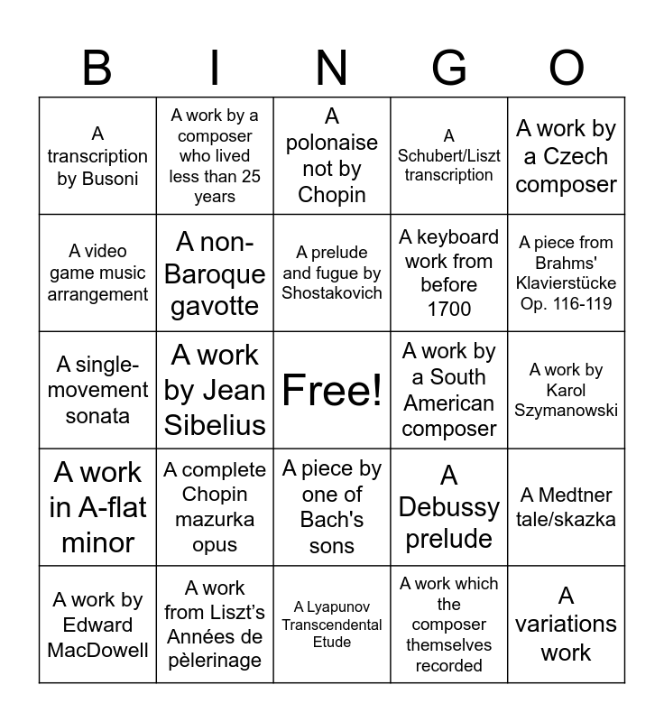 This bingo card has a free space and 24 words: A work by Edward MacDowell, A complete Chopin mazurka opus, A prelude and fugue by Shostakovich, A work which the composer themselves recorded, A work by a Czech composer, A transcription by Busoni, A work by a composer who lived less than 25 years, A polonaise not by Chopin, A work by a South American composer, A work by Karol Szymanowski, A single-movement sonata, A non-Baroque gavotte, A Debussy prelude, A Medtner tale/skazka, A video game music arrangement, A work from Liszt’s Années de pèlerinage, A Lyapunov Transcendental Etude, A Schubert/Liszt transcription, A piece from Brahms' Klavierstücke Op. 116-119, A work in A-flat minor, A work by Jean Sibelius, A piece by one of Bach's sons, A keyboard work from before 1700 and A variations work.