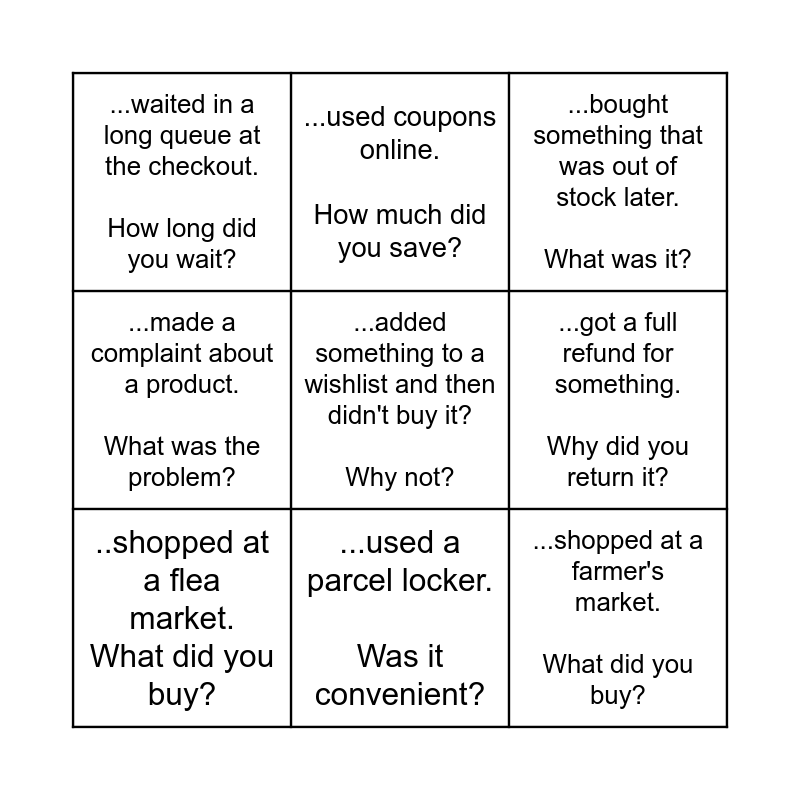 This bingo card has 9 words: ..shopped at a flea market. What did you buy?, ...bought something that was out of stock later. What was it?, ...used coupons online. How much did you save?, ...made a complaint about a product. What was the problem?, ...waited in a long queue at the checkout. How long did you wait?, ...got a full refund for something. Why did you return it?, ...added something to a wishlist and then didn't buy it? Why not?, ...shopped at a farmer's market. What did you buy? and ...used a parcel locker. Was it convenient?.