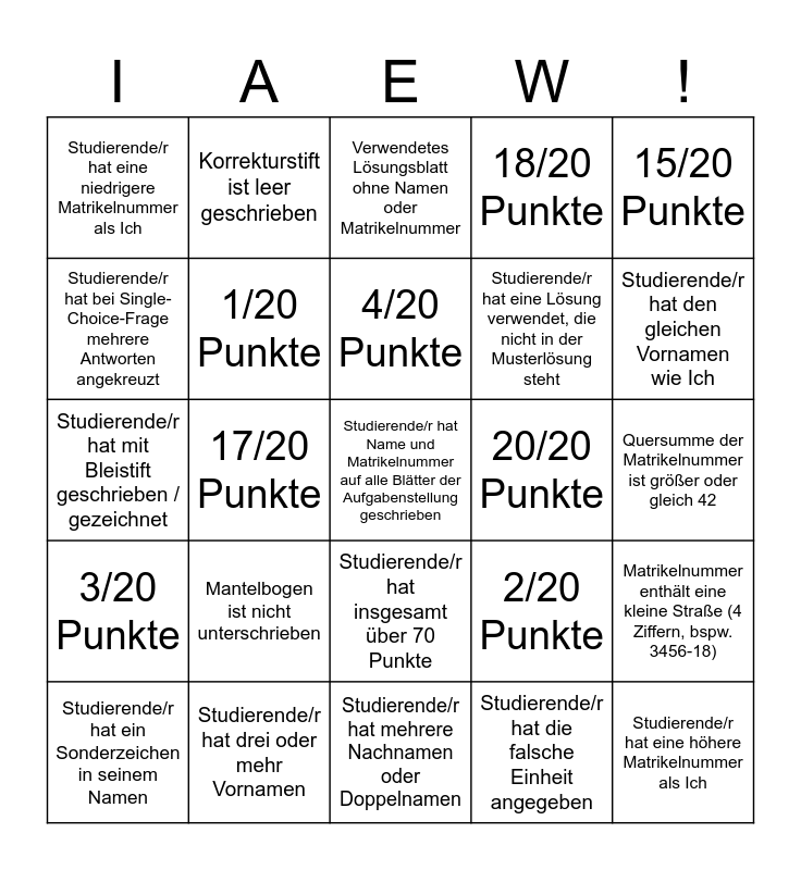 This bingo card has 36 words: Free!, Studierende/r hat Aufgabe gar nicht bearbeitet, 0/20 Punkte (aber bearbeitet), 1/20 Punkte, 2/20 Punkte, 3/20 Punkte, 4/20 Punkte, 5/20 Punkte, 15/20 Punkte, 16/20 Punkte, 17/20 Punkte, 18/20 Punkte, 19/20 Punkte, 20/20 Punkte, Studierende/r hat den gleichen Vornamen wie Ich, Studierende/r hat eine niedrigere Matrikelnummer als Ich, Studierende/r hat eine höhere Matrikelnummer als Ich, Mantelbogen ist nicht unterschrieben, Studierende/r hat Name und Matrikelnummer auf alle Blätter der Aufgabenstellung geschrieben, Verwendetes Lösungsblatt ohne Namen oder Matrikelnummer, Quersumme der Matrikelnummer ist größer oder gleich 42, Matrikelnummer enthält eine kleine Straße (4 Ziffern, bspw. 3456-18), Studierende/r hat drei oder mehr Vornamen, Studierende/r hat ein Sonderzeichen in seinem Namen, Studierende/r hat mehrere Nachnamen oder Doppelnamen, Korrekturstift ist leer geschrieben, Studierende/r hat mit Bleistift geschrieben / gezeichnet, Ich habe bei der Zweitkorrektur ein falsches Zusammenrechnen von Punkten aufgedeckt, Studierende/r hat eine Lösung verwendet, die nicht in der Musterlösung steht, Studierende/r hat bei Single-Choice-Frage mehrere Antworten angekreuzt, Studierende/r hat die Rückseite vom Lösungsblatt beschrieben, Ich kenne die/den Studierende/n persönlich, Studierende/r hat die falsche Einheit angegeben, Studierende/r hat insgesamt über 70 Punkte, Studierende/r hat insgesamt unter 15 Punkte and Studierende/r hat die gesamte Lösung einer Teilaufgabe durchgestrichen.