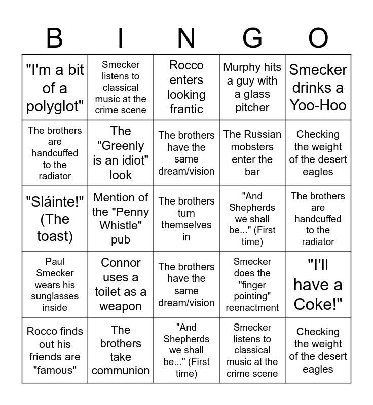 This bingo card has 60 words: Free!, The brothers take communion, Connor drops the huge crate of meat, Paul Smecker wears his sunglasses inside, Smecker listens to classical music at the crime scene, "Why don't you get me a sandwich?", The "Greenly is an idiot" look, Mention of the "Penny Whistle" pub, The Russian mobsters enter the bar, "Sláinte!" (The toast), Murphy hits a guy with a glass pitcher, Connor uses a toilet as a weapon, The brothers are handcuffed to the radiator, The "A-VP" (All-Victim Police) joke, Smecker does the "finger pointing" reenactment, "I'm a bit of a polyglot", The brothers turn themselves in, Smecker drinks a Yoo-Hoo, "Television. Television is the explanation.", The brothers have the same dream/vision, "And Shepherds we shall be..." (First time), Rocco enters looking frantic, Rocco finds out his friends are "famous", "I'll have a Coke!", The brothers buy a massive amount of rope, "You don't need stupid rope!", Connor packs the "holy water", The brothers dye their hair/change clothes, Checking the weight of the desert eagles, Rocco gets "the finger" from his boss, The priest kisses the ring, The brothers take communion, Connor drops the huge crate of meat, Paul Smecker wears his sunglasses inside, Smecker listens to classical music at the crime scene, "Why don't you get me a sandwich?", The "Greenly is an idiot" look, Mention of the "Penny Whistle" pub, The Russian mobsters enter the bar, "Sláinte!" (The toast), Murphy hits a guy with a glass pitcher, Connor uses a toilet as a weapon, The brothers are handcuffed to the radiator, The "A-VP" (All-Victim Police) joke, Smecker does the "finger pointing" reenactment, "I'm a bit of a polyglot", The brothers turn themselves in, Smecker drinks a Yoo-Hoo, "Television. Television is the explanation.", The brothers have the same dream/vision, "And Shepherds we shall be..." (First time), Rocco enters looking frantic, Rocco finds out his friends are "famous", "I'll have a Coke!", The brothers buy a massive amount of rope, "You don't need stupid rope!", Connor packs the "holy water", The brothers dye their hair/change clothes, Checking the weight of the desert eagles and Rocco gets "the finger" from his boss.