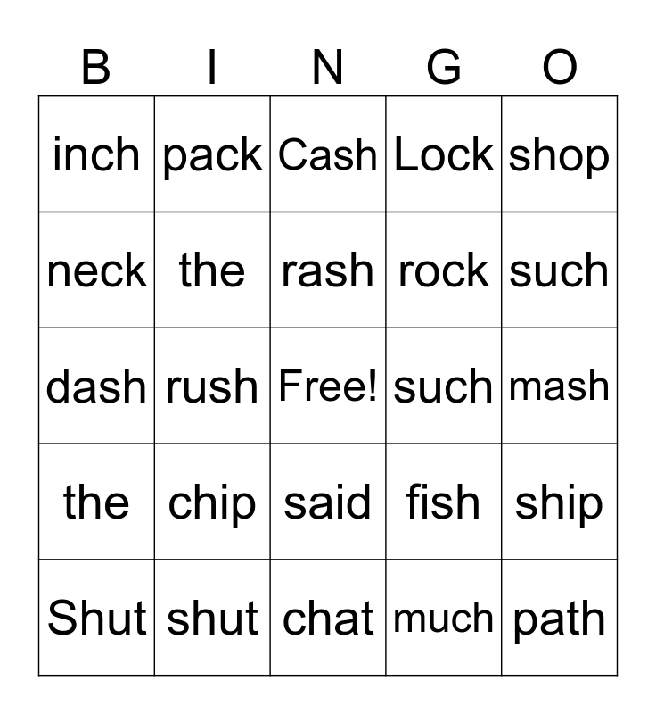 This bingo card has a free space and 29 words: Shut, duck, rush, pick, inch, Cash, the, chip, such, shut, mash, path, chat, much, such, dish, said, the, shop, dash, fish, black, rock, neck, Lock, pack, ship, rash and shell.