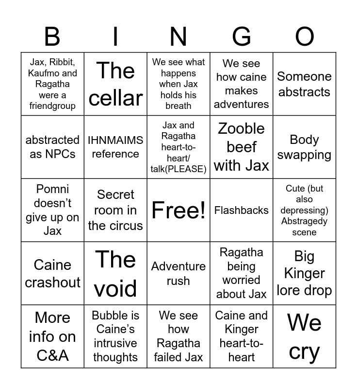 This bingo card has a free space and 24 words: The void, Bubble is Caine’s intrusive thoughts, Jax and Ragatha heart-to-heart/ talk(PLEASE), More info on C&A, Someone abstracts, Jax, Ribbit, Kaufmo and Ragatha were a friendgroup, abstracted as NPCs, The cellar, Flashbacks, Adventure rush, Zooble beef with Jax, Pomni doesn’t give up on Jax, Ragatha being worried about Jax, Big Kinger lore drop, IHNMAIMS reference, Caine and Kinger heart-to-heart, Cute (but also depressing) Abstragedy scene, We see what happens when Jax holds his breath, Body swapping, Secret room in the circus, We cry, Caine crashout, We see how caine makes adventures and We see how Ragatha failed Jax.