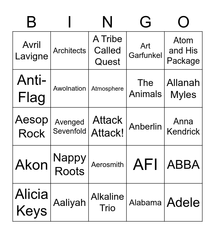 This bingo card has 40 words: Marshmello ft. A Day to Remember, Aesop Rock, Aaron Tippin, Awolnation, Aaliyah, Aerosmith, Atmosphere, AC/DC, Atom and His Package, Akon, Avenged Sevenfold, Art Garfunkel, Attack Attack!, Anna Kendrick, Anberlin, Nappy Roots, Angels & Airwaves, Avril Lavigne, Amy Winehouse, A Tribe Called Quest, ABBA, Alabama, The Animals, Anti-Flag, Aqua, Andre3000, Arctic Monkeys, All-4-One, Adele, The Ataris, Amber Run, Alicia Keys, Arcade Fire, AFI, Allanah Myles, Alkaline Trio, Ariana Grande, Alabama Shakes, Architects and Maroon 5.