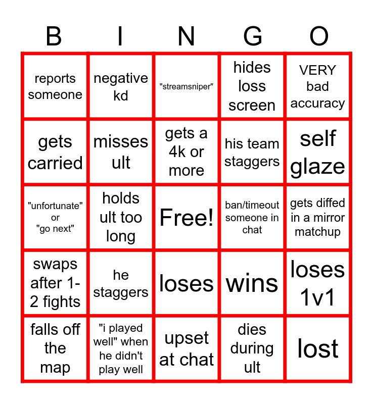 This bingo card has a free space and 34 words: HARD feeds, dies during ult, blames dps, blames support, swaps after 1-2 fights, misses ult, VERY bad accuracy, falls off the map, negative kd, blames "smurfs" or "cheaters", gets a 4k or more, "streamsniper", gets solo ulted, leaver on either team, ban/timeout someone in chat, self glaze, "i played well" when he didn't play well, "unfortunate" or "go next", he staggers, wins, loses, avoids teammates, reports someone, gets diffed in a mirror matchup, upset at chat, lost, hides loss screen, derank or rank up, his team staggers, gets carried, life gripped at bad time, holds ult too long, loses 1v1 and wins 1v1.