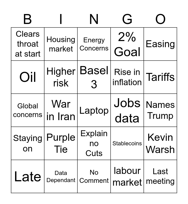 This bingo card has a free space and 24 words: Purple Tie, Data Dependant, Basel 3, Late, Easing, Clears throat at start, Oil, Housing market, Jobs data, Explain no Cuts, Rise in inflation, Global concerns, Stablecoins, Kevin Warsh, Higher risk, labour market, Names Trump, Energy Concerns, Tariffs, War in Iran, Last meeting, Staying on, 2% Goal and No Comment.