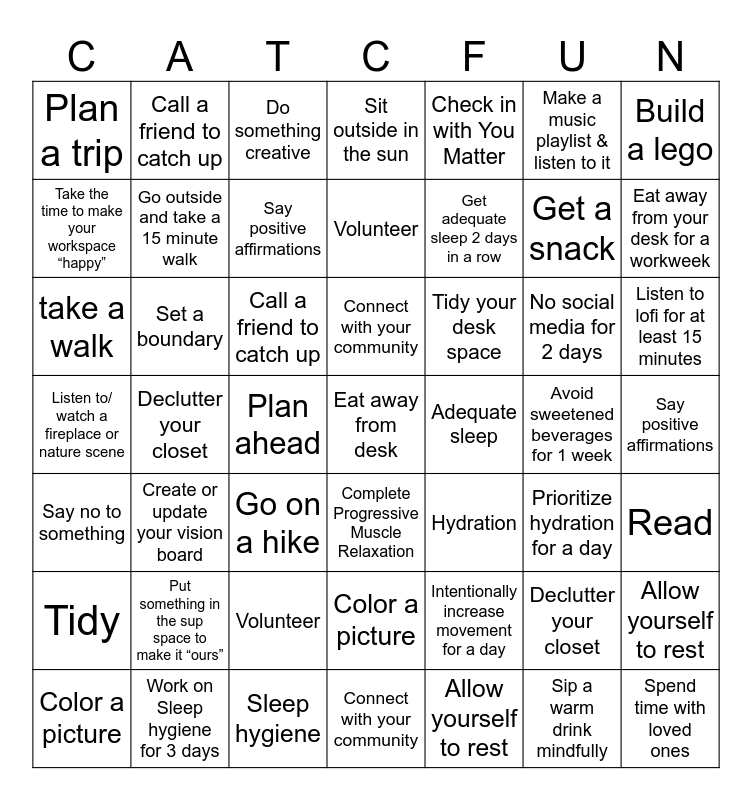 ⚠ This card has duplicate items: Connect with your community (2), Check in with You Matter (2), Ask for help (2), Allow yourself to rest (2), Avoid sweetened beverages for 1 week (2), Declutter your closet (2), Create or update your vision board (2), Journal about your day for a week (2), Try a new recipe (2), No social media for 2 days (2), Take the time to make your workspace “happy” (2), Color a picture (2), Volunteer (3), Eat nourishing food (2), Do something creative (2), Sit outside in the sun (2), Call a friend to catch up (2), Plan a trip (2), Go on a hike (2), Say positive affirmations (2)