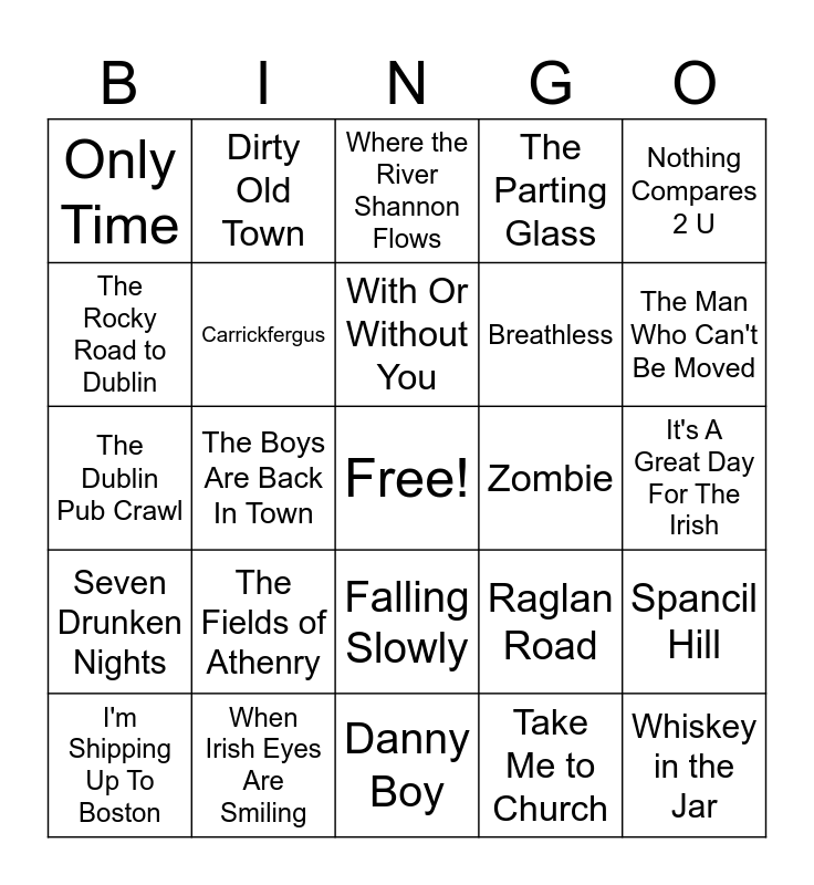 This bingo card has a free space and 48 words: The Wild Rover, Whiskey in the Jar, Molly Malone, Danny Boy, The Fields of Athenry, The Galway Girl, Dirty Old Town, The Irish Rover, The Rocky Road to Dublin, Finnegan's Wake, Carrickfergus, The Parting Glass, Spancil Hill, Raglan Road, The Town I Loved So Well, Red Is The Rose, With Or Without You, Zombie, Brown Eyed Girl, Nothing Compares 2 U, The Boys Are Back In Town, Take Me to Church, Only Time, Breathless, Chasing Cars, The Man Who Can't Be Moved, I'm Shipping Up To Boston, The Blower's Daughter, Falling Slowly, Seven Drunken Nights, Ride On, Theme from Harry's Game, Moonchild, The Great Defector, When Irish Eyes Are Smiling, I'll Tell Me Ma, My Wild Irish Rose, It's A Great Day For The Irish, Paddy Mcginty's Goat, Mother Machree, Peg O' My Heart, Did Your Mother Come from Ireland?, Where the River Shannon Flows, Irish Pub Song, The Dublin Pub Crawl, Drunken Lullabies, Drunken Sailor and Kiss Me I'm #!@'faced.