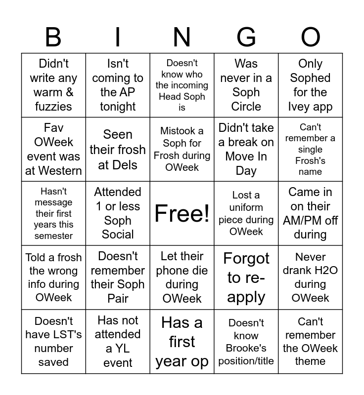This bingo card has a free space and 24 words: Doesn't remember their Soph Pair, Has not attended a YL event, Mistook a Soph for Frosh during OWeek, Doesn't have LST's number saved, Only Sophed for the Ivey app, Didn't write any warm & fuzzies, Fav OWeek event was at Western, Isn't coming to the AP tonight, Lost a uniform piece during OWeek, Let their phone die during OWeek, Didn't take a break on Move In Day, Hasn't message their first years this semester, Forgot to re-apply, Never drank H2O during OWeek, Seen their frosh at Dels, Doesn't know Brooke's position/title, Came in on their AM/PM off during, Doesn't know who the incoming Head Soph is, Can't remember a single Frosh's name, Attended 1 or less Soph Social, Can't remember the OWeek theme, Told a frosh the wrong info during OWeek, Was never in a Soph Circle and Has a first year op.