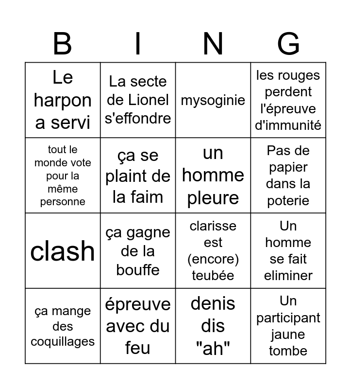 This bingo card has 16 words: ça mange des coquillages, épreuve avec du feu, mysoginie, les rouges perdent l'épreuve d'immunité, tout le monde vote pour la même personne, La secte de Lionel s'effondre, clarisse est (encore) teubée, Un homme se fait eliminer, Le harpon a servi, ça se plaint de la faim, denis dis "ah", Pas de papier dans la poterie, clash, ça gagne de la bouffe, un homme pleure and Un participant jaune tombe.