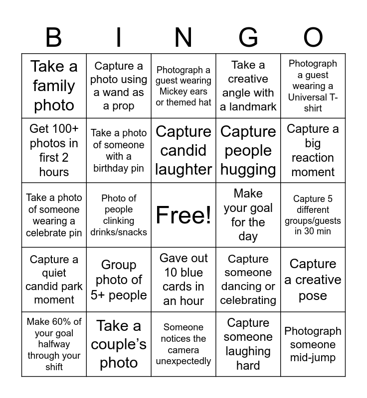 This bingo card has a free space and 24 words: Group photo of 5+ people, Take a couple’s photo, Capture candid laughter, Make 60% of your goal halfway through your shift, Photograph a guest wearing a Universal T-shirt, Take a family photo, Get 100+ photos in first 2 hours, Capture a photo using a wand as a prop, Make your goal for the day, Gave out 10 blue cards in an hour, Capture people hugging, Take a photo of someone wearing a celebrate pin, Capture someone dancing or celebrating, Capture a creative pose, Take a photo of someone with a birthday pin, Capture someone laughing hard, Capture 5 different groups/guests in 30 min, Photograph a guest wearing Mickey ears or themed hat, Capture a big reaction moment, Photo of people clinking drinks/snacks, Photograph someone mid-jump, Capture a quiet candid park moment, Take a creative angle with a landmark and Someone notices the camera unexpectedly.
