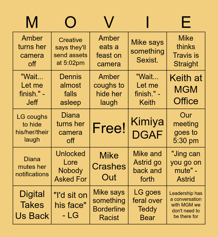 This bingo card has a free space and 31 words: Mike says something Borderline Racist, Becca gets cut off by a random tangent, Diana turns her camera off, LG turns his/her/their camera off, Amber turns her camera off, Amber eats a feast on camera, Dennis almost falls asleep, Mike and Astrid go back and forth, Kimiya DGAF, LG goes feral over Teddy Bear, Our meeting goes to 5:30 pm, Leadership has a conversation with MGM we don't need to be there for, "How did we get here?", Jeff's Air Pods don't work, Keith at MGM Office, Jing gets one word in, "Jing can you go on mute" - Astrid, Unlocked Lore Nobody Asked For, Diana mutes her notifications, Mike Crashes Out, Mike thinks Travis is Straight, Late to Status bc We're Clean/Well Rested, Digital Takes Us Back, Creative says they'll send assets at 5:02pm, "Wait... Let me finish." - Keith, "Wait... Let me finish." - Jeff, Mike says something Sexist., LG coughs to hide his/her/their laugh, "I'd sit on his face" - LG, Amber coughs to hide her laugh and Diana coughs to hide his/her/their laughs.