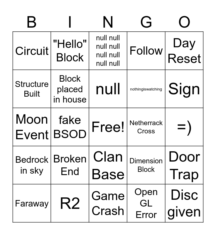 This bingo card has a free space and 24 words: Broken End, R2, null, Faraway, Day Reset, Circuit, Structure Built, "Hello" Block, Netherrack Cross, Clan Base, nothingiswatching, Moon Event, Dimension Block, Door Trap, Block placed in house, Open GL Error, =), null null null null null null null null, Sign, fake BSOD, Disc given, Bedrock in sky, Follow and Game Crash.