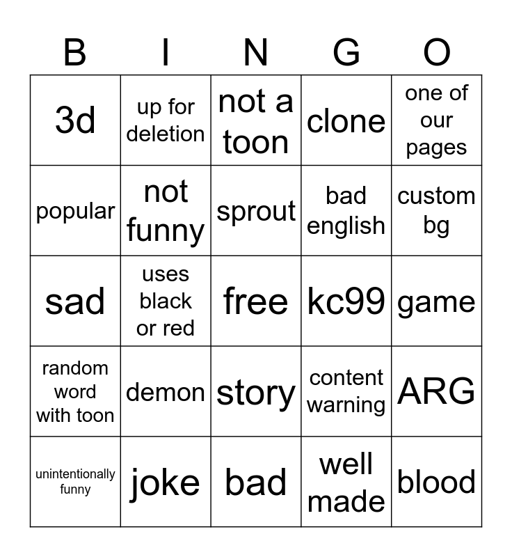 This bingo card has a free space and 24 words: demon, joke, sprout, unintentionally funny, one of our pages, 3d, popular, up for deletion, kc99, story, bad english, sad, content warning, ARG, not funny, well made, game, not a toon, custom bg, uses black or red, blood, random word with toon, clone and bad.