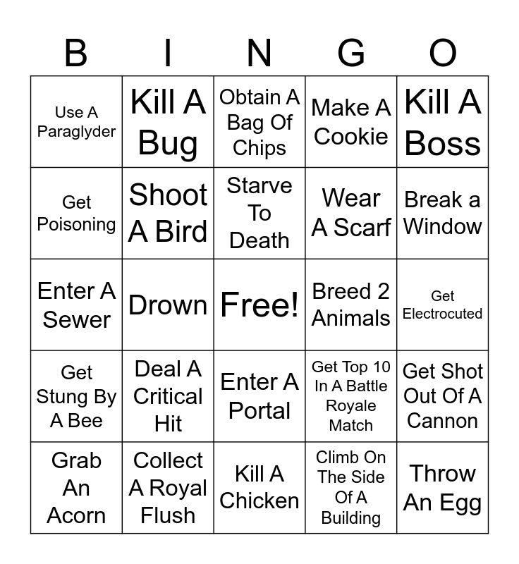 This bingo card has a free space and 24 words: Deal A Critical Hit, Collect A Royal Flush, Starve To Death, Grab An Acorn, Kill A Boss, Use A Paraglyder, Get Poisoning, Kill A Bug, Breed 2 Animals, Enter A Portal, Wear A Scarf, Enter A Sewer, Get Top 10 In A Battle Royale Match, Get Shot Out Of A Cannon, Shoot A Bird, Climb On The Side Of A Building, Get Electrocuted, Obtain A Bag Of Chips, Break a Window, Drown, Throw An Egg, Get Stung By A Bee, Make A Cookie and Kill A Chicken.