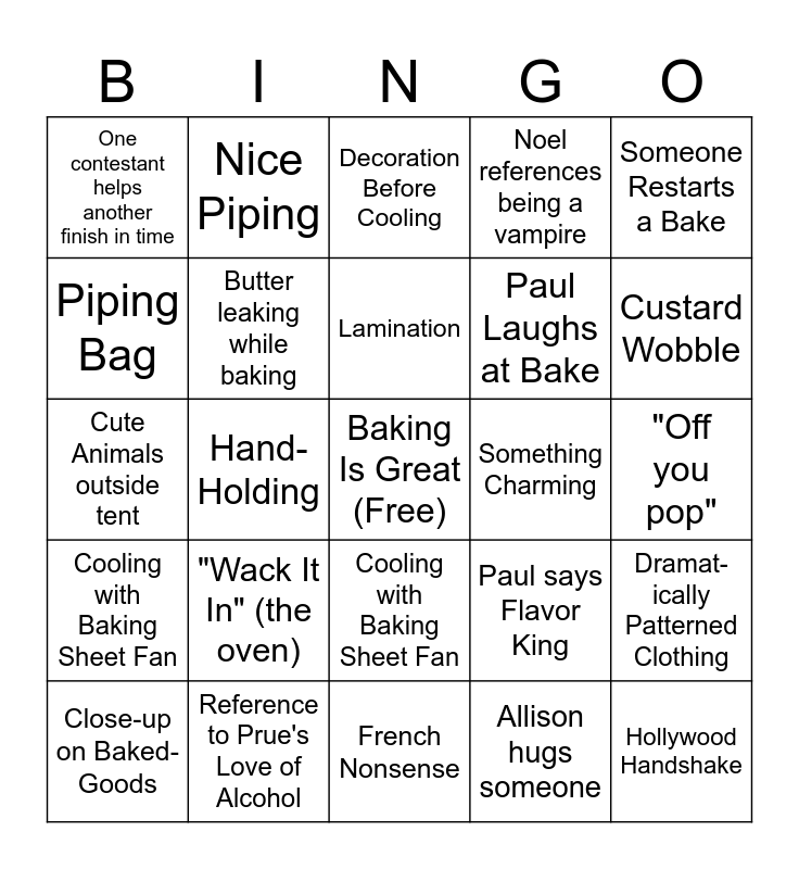 This bingo card has a free space and 44 words: Soggy Bottom, "Wack It In" (the oven), Someone Cries, Allison hugs someone, Raw dough, Reference to Paul's eyes or skin, Butter leaking while baking, Poor lamination, Noel references being a vampire, Hollywood Handshake, One contestant helps another finish in time, Reference to Prue's Love of Alcohol, Paul says Flavor King, "Off you pop", Over-Proved, Under-Proved, French Nonsense, Something Charming, Hilarious English Slang, Cute Animals outside tent, Nice Piping, Cooling with Baking Sheet Fan, Sexual Innuendo or Humor, Someone Restarts a Bake, Paul Stares, Something Goes in the Cooler, Lamination, Butter, Dramat-ically Patterned Clothing, Close-up on Baked-Goods, *Stares into Oven*, Decoration Before Cooling, Dramatic Pause During Judging, Host Antics, Cooling with Baking Sheet Fan, Too Dry, Someone Restarts a Bake, Paul asks Ominous Question, Custard Wobble, Piping Bag, Hand-Holding, "Good Color", Paul Laughs at Bake and Baker Surprised by their Success.