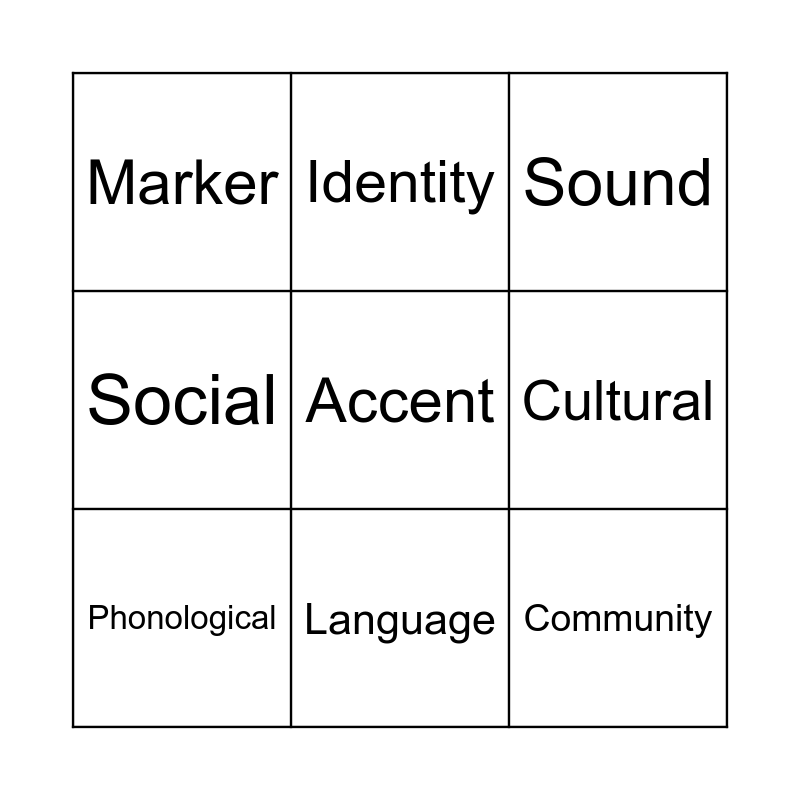 This bingo card has 9 words: Phonological, Sound, Identity, Social, Marker, Cultural, Accent, Community and Language.