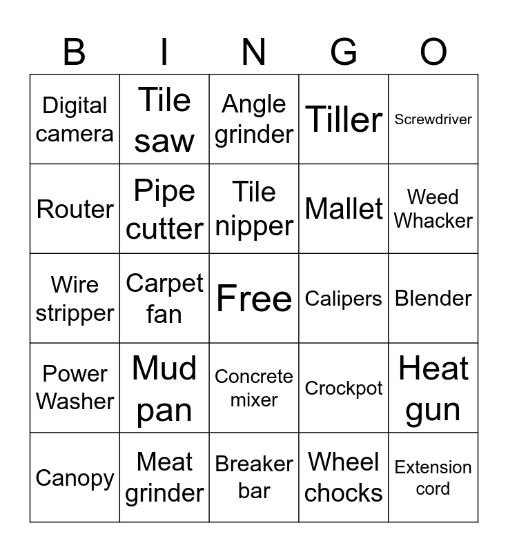 This bingo card has a free space and 101 words: Wrench, Pliers, Screwdriver, Miter Saw, Circular Saw, Level, Tape Measure, Sewing Machine, Stand Mixer, Camping Tent, Microphone, Shop Vac, Bar Clamp, Karaoke Machine, Cooler, Shovel, Power Washer, Lawn Mower, Drill, Nail Gun, Orbital Sander, Drill Press, Planer, T-Shirt Press, 3D Printer, Weed Whacker, Tiller, Mud pan, Chisel, Drill bit, Tile saw, Angle grinder, Rotozip, Hammer drill, Jack hammer, Concrete mixer, Bike pump, Socket set, Wheel chocks, Breaker bar, Air compressor, Canopy, Folding chair, Folding table, Wire brush, Extension cord, Bow rake, Saw horse, Tamper, Jig saw, Pocket hole jig, Router, Bullhorn, Hard hat, Face shield, Seed spreader, Paper trimmer, Paint roller, Bolt cutter, Crow bar, Pipe cutter, Floor scraper, Earmuffs, Stapler, Leaf blower, Mallet, Stud finder, Carpet fan, Meat grinder, Bungee cord, Jack stand, Nut driver, Digital camera, Bucket, Tile nipper, Wire stripper, Yarn winder, Sledge hammer, Coffee urn, Garden claw, Metal detector, Speed square, Calipers, Chalk line, Hot glue gun, Mat cutter, Blender, Photo scanner, Ice cream maker, Cake pan, Crockpot, BBQ fork, Electric juicer, Headlamp, Drain snake, Heat gun, Squeegee, Ironing board, Dress form, Propane torch and Knee pads.