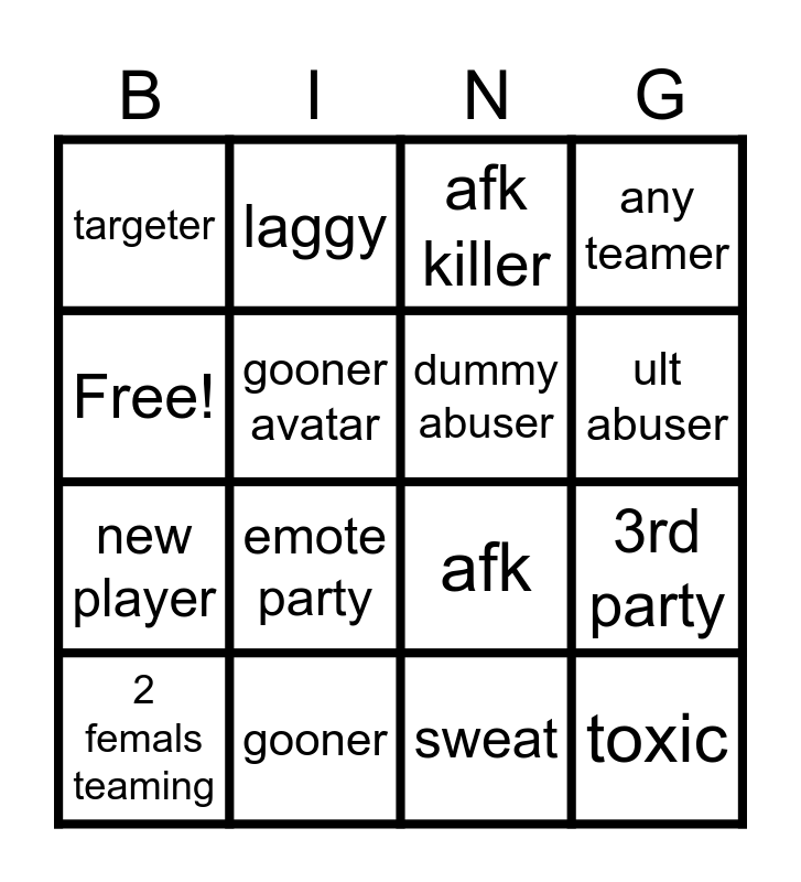 This bingo card has 16 words: gooner, 3rd party, afk killer, targeter, new player, laggy, afk, sweat, Free!, gooner avatar, 2 femals teaming, any teamer, emote party, ult abuser, dummy abuser and toxic.