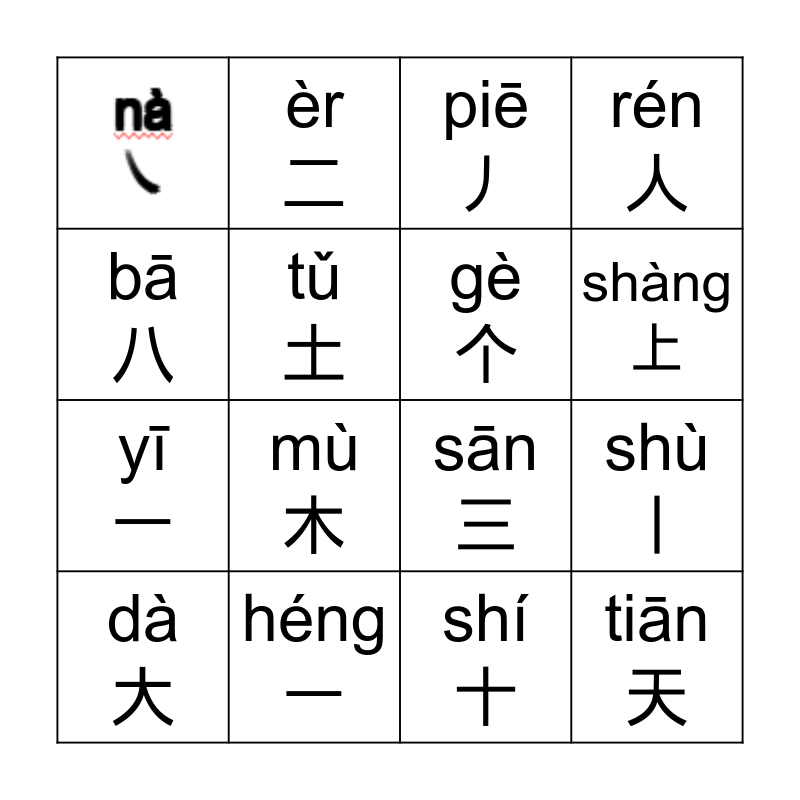 This bingo card has 1 images and 15 words: héng 一, shù 丨, piē 丿, yī 一, èr 二, sān 三, shí 十, bā 八, tǔ 土, dà 大, rén 人, mù 木, shàng上, gè 个 and tiān 天.