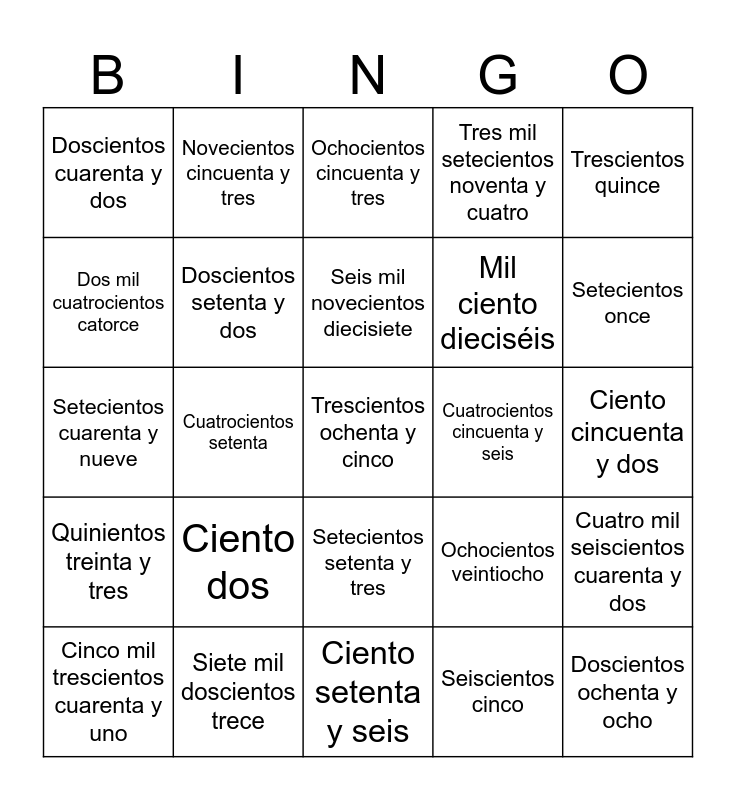 This bingo card has 30 words: Siete mil doscientos trece, Setecientos setenta y siete, Cuatrocientos setenta, Ciento sesenta y dos, Doscientos cuarenta y dos, Ochocientos cincuenta y tres, Doscientos setenta y dos, Setecientos setenta y tres, Cuatrocientos cincuenta y seis, Ciento setenta y seis, Ciento cincuenta y dos, Trescientos ochenta y cinco, Seiscientos cinco, Doscientos ochenta y ocho, Setecientos once, Cuatrocientos cincuenta y ocho, Ochocientos veintiocho, Quinientos treinta y tres, Ciento dos, Trescientos quince, Setecientos cuarenta y nueve, Doscientos setenta y ocho, Novecientos cincuenta y tres, Mil ciento dieciséis, Dos mil cuatrocientos catorce, Tres mil setecientos noventa y cuatro, Cuatro mil seiscientos cuarenta y dos, Cinco mil trescientos cuarenta y uno, Seis mil novecientos diecisiete and Seis mil veintiuno.