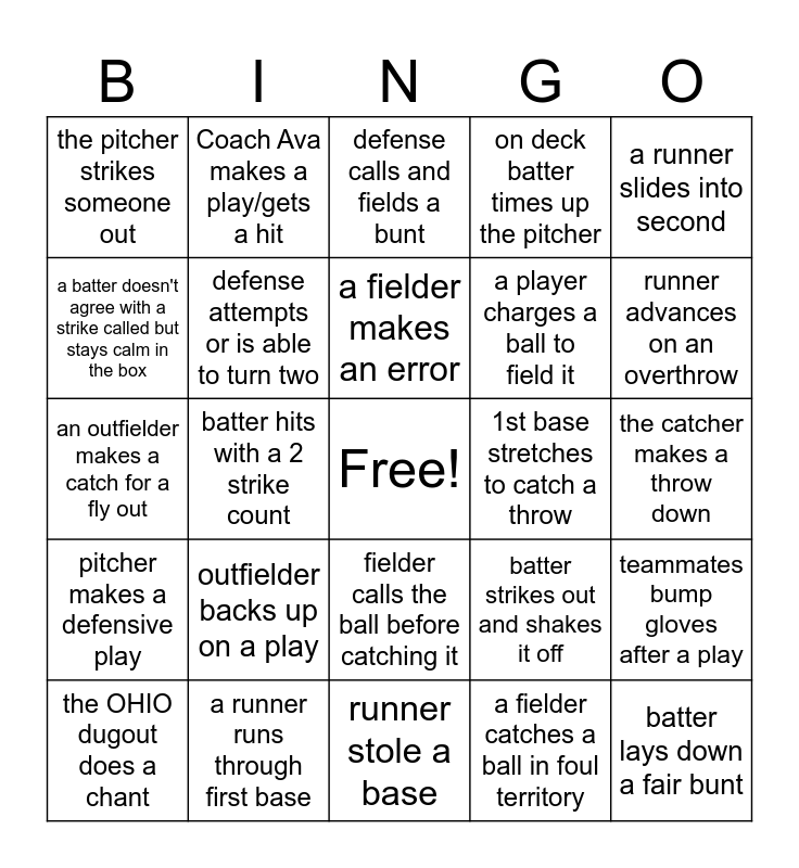 This bingo card has a free space and 24 words: outfielder backs up on a play, a runner runs through first base, a fielder makes an error, the OHIO dugout does a chant, a runner slides into second, the pitcher strikes someone out, a batter doesn't agree with a strike called but stays calm in the box, Coach Ava makes a play/gets a hit, 1st base stretches to catch a throw, fielder calls the ball before catching it, a player charges a ball to field it, an outfielder makes a catch for a fly out, batter strikes out and shakes it off, teammates bump gloves after a play, defense attempts or is able to turn two, a fielder catches a ball in foul territory, the catcher makes a throw down, defense calls and fields a bunt, runner advances on an overthrow, batter hits with a 2 strike count, batter lays down a fair bunt, pitcher makes a defensive play, on deck batter times up the pitcher and runner stole a base.