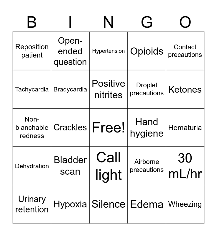 This bingo card has a free space and 33 words: Fall risk, Glucose, Crackles, 2 patient identifiers, Dehydration, Bradycardia, Contact precautions, Urinary retention, Open-ended question, Elevate head of bed, Positive nitrites, Hypertension, Constipation, Reflection, Hand hygiene, Ketones, Hypoxia, Non-blanchable redness, Bladder scan, Airborne precautions, Call light, Hypotension, Reposition patient, Hematuria, Silence, Wheezing, Opioids, Droplet precautions, Tachycardia, 30 mL/hr, Infection, Edema and Clarification.