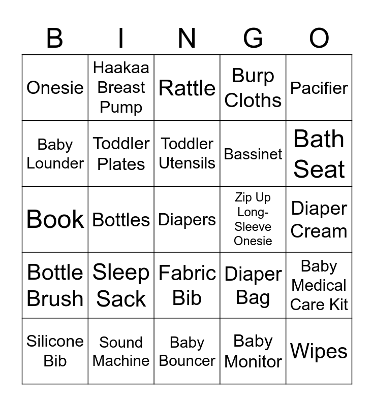 This bingo card has a free space and 39 words: Baby Carrier, Pack N' Play, Toddler Bowls, Toddler Plates, Silicone Bib, Fabric Bib, Toddler Utensils, Sippy Cup, Pacifier, Bottle Brush, Bottles, Burp Cloths, Wipes, Diaper Cream, Zip Up Long-Sleeve Onesie, Sleep Sack, Swaddle Blanket, Onesie, Diaper Change Kit, Diaper Bag, Baby Lounder, Baby Bouncer, Bassinet, Bath Seat, Bath Linens, Play Gym, Nursing Cover, Boppy Pillow, Car Mirror, Haakaa Breast Pump, Car Seat, Stroller Fan, Rattle, Sound Machine, Baby Monitor, Baby Blanket, Baby Medical Care Kit, Book and Jolly Jumper.