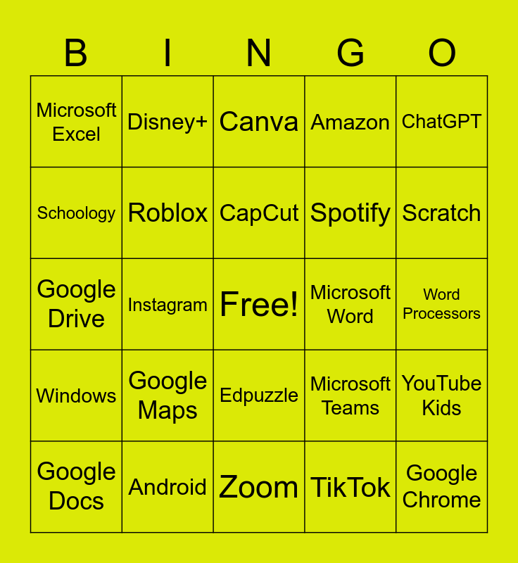 This bingo card has a free space and 29 words: Google Docs, Gmail, Instagram, Netflix, Microsoft Excel, Canva, Roblox, Google Maps, Microsoft Word, Android, Word Processors, Google Chrome, Zoom, TikTok, Scratch, Code.org, Edpuzzle, Windows, ChatGPT, Google Drive, Microsoft Teams, Nearpod, Spotify, Schoology, Amazon, Disney+, YouTube Kids, CapCut and Google Meet.