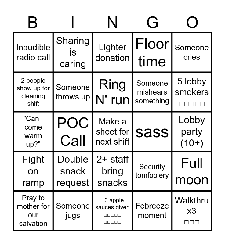 This bingo card has a free space and 24 words: Double snack request, Someone jugs, Ring N' run, Pray to mother for our salvation, Someone cries, Inaudible radio call, 2 people show up for cleaning shift, Sharing is caring, sass, 2+ staff bring snacks, Someone mishears something, "Can I come warm up?", Security tomfoolery, Full moon, Someone throws up, Febreeze moment, Lobby party (10+), Lighter donation, 5 lobby smokers □□□□□, POC Call, Walkthru x3 □□□, Fight on ramp, Floor time and 10 apple sauces given □□□□□ □□□□□.