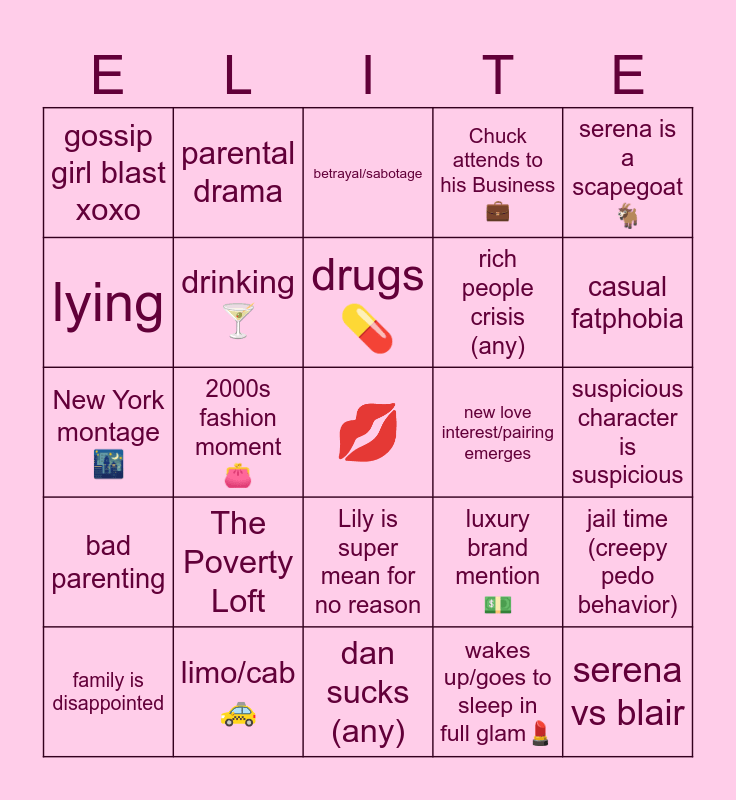 This bingo card has a free space and 29 words: family is disappointed, Blair & Chuck drama, 2000s fashion moment π, rich people party (any), gossip girl blast xoxo, betrayal/sabotage, drinking πΈ, The Poverty Loft, new love interest/pairing emerges, limo/cab π, suspicious character is suspicious, serena vs blair, dan sucks (any), wakes up/goes to sleep in full glamπ, casual fatphobia, Blair is diabolical, Lily is super mean for no reason, bad parenting, serena is a scapegoat π, New York montage π, luxury brand mention π΅, shopping ποΈ, rich people crisis (any), lying, Chuck attends to his Business πΌ, parental drama, jail time (creepy pedo behavior), drugs π and something ages like milk π₯.