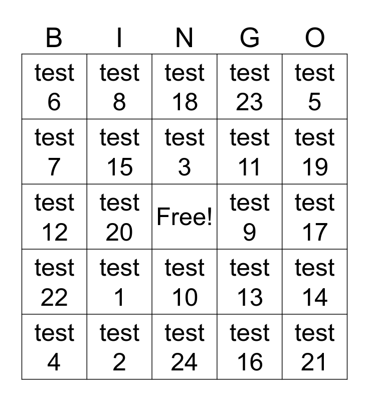 This bingo card has a free space and 24 words: test 1, test 2, test 3, test 4, test 5, test 6, test 7, test 8, test 9, test 10, test 11, test 12, test 13, test 14, test 15, test 16, test 17, test 18, test 19, test 20, test 21, test 22, test 23 and test 24.