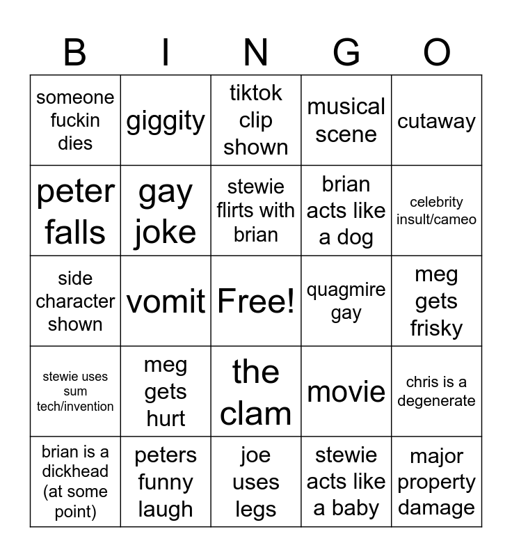 This bingo card has a free space and 24 words: meg gets hurt, peters funny laugh, stewie flirts with brian, brian is a dickhead (at some point), cutaway, someone fuckin dies, peter falls, giggity, quagmire gay, the clam, brian acts like a dog, side character shown, movie, chris is a degenerate, gay joke, stewie acts like a baby, meg gets frisky, tiktok clip shown, celebrity insult/cameo, vomit, major property damage, stewie uses sum tech/invention, musical scene and joe uses legs.
