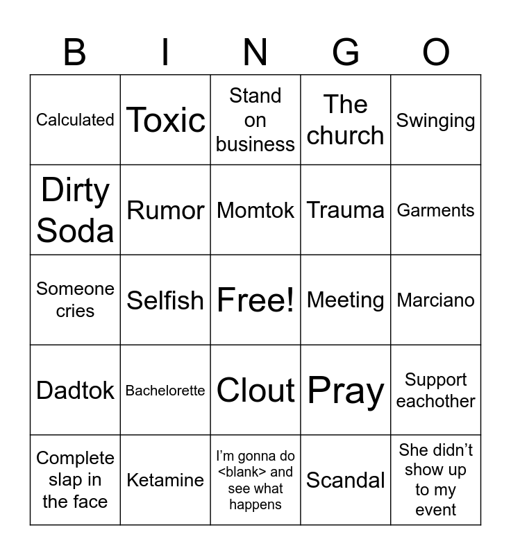 This bingo card has a free space and 26 words: Clout, Scandal, Momtok, Ketamine, Swinging, Calculated, Dirty Soda, Toxic, Marciano, Pray, Trauma, Someone cries, Support eachother, Complete slap in the face, Selfish, I just want to feel heard, The church, Dadtok, Stand on business, She didn’t show up to my event, Garments, I’m gonna do <blank> and see what happens, Meeting, Bachelorette, Rumor and Relationship.