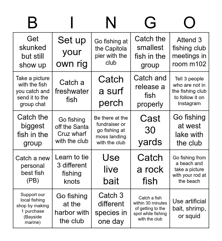 This bingo card has a free space and 24 words: Learn to tie 3 different fishing knots, Go fishing at the harbor with the club, Catch a surf perch, Support our local fishing shop by making 1 purchase (Bayside marine), Attend 3 fishing club meetings in room m102, Get skunked but still show up, Take a picture with the fish you catch and send it to the group chat, Set up your own rig, Cast 30 yards, Use live bait, Catch and release a fish properly, Catch the biggest fish in the group, Catch a rock fish, Go fishing from a beach and take a picture with your rod at the beach, Catch a freshwater fish, Catch a fish within 30 minutes of getting to the spot while fishing with the club, Go fishing at west lake with the club, Go fishing at the Capitola pier with the club, Tell 3 people who are not in the fishing club to follow it on Instagram, Go fishing off the Santa Cruz wharf with the club, Use artificial bait, shrimp, or squid, Catch a new personal best fish (PB), Catch the smallest fish in the group and Catch 3 different species in one day.