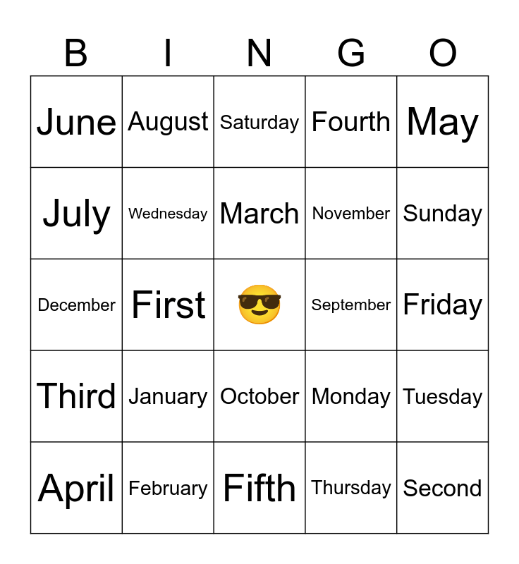 This bingo card has a free space and 24 words: January, February, March, April, May, June, July, August, September, October, November, December, Monday, Tuesday, Wednesday, Thursday, Friday, Saturday, Sunday, First, Second, Third, Fourth and Fifth.