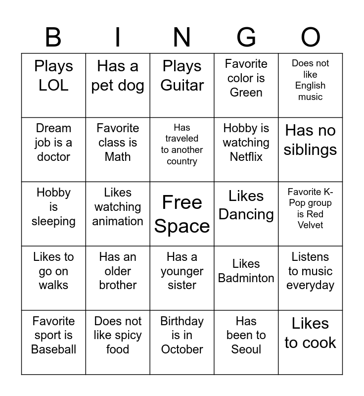 This bingo card has a free space and 24 words: Has an older brother, Does not like spicy food, Has traveled to another country, Favorite sport is Baseball, Does not like English music, Plays LOL, Dream job is a doctor, Has a pet dog, Likes Dancing, Has a younger sister, Hobby is watching Netflix, Hobby is sleeping, Likes Badminton, Listens to music everyday, Favorite class is Math, Has been to Seoul, Favorite K-Pop group is Red Velvet, Plays Guitar, Has no siblings, Likes watching animation, Likes to cook, Likes to go on walks, Favorite color is Green and Birthday is in October.