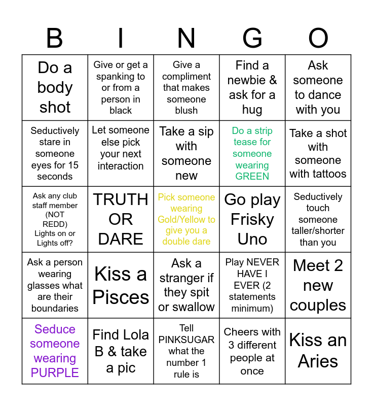 This bingo card has a free space and 24 words: Kiss a Pisces, Find Lola B & take a pic, Take a sip with someone new, Seduce someone wearing PURPLE, Ask someone to dance with you, Do a body shot, Seductively stare in someone eyes for 15 seconds, Give or get a spanking to or from a person in black, Go play Frisky Uno, Ask a stranger if they spit or swallow, Do a strip tease for someone wearing GREEN, Ask any club staff member (NOT REDD) Lights on or Lights off?, Play NEVER HAVE I EVER (2 statements minimum), Meet 2 new couples, Let someone else pick your next interaction, Cheers with 3 different people at once, Seductively touch someone taller/shorter than you, Give a compliment that makes someone blush, Take a shot with someone with tattoos, TRUTH OR DARE, Kiss an Aries, Ask a person wearing glasses what are their boundaries, Find a newbie & ask for a hug and Tell PINKSUGAR what the number 1 rule is.