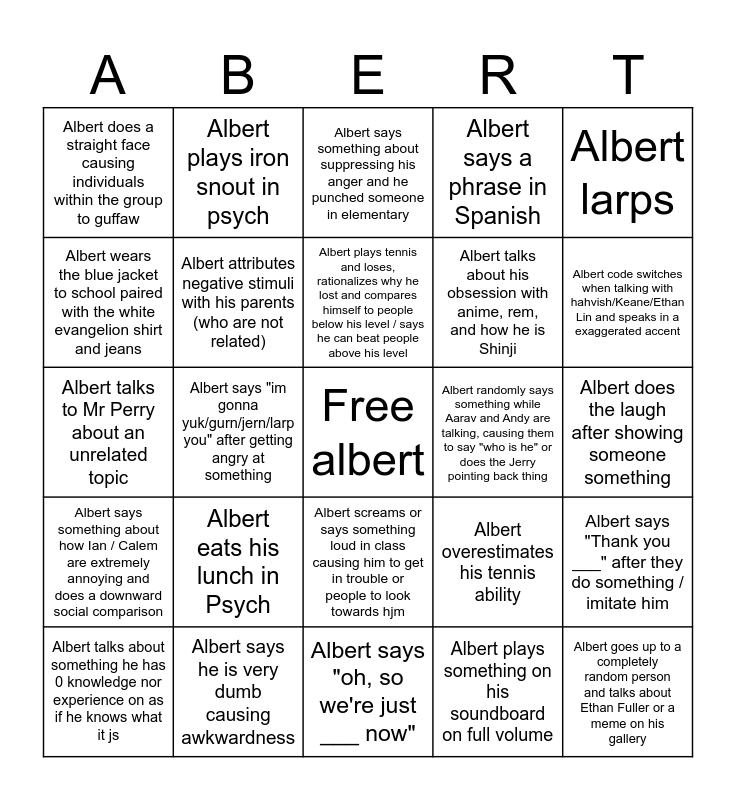 This bingo card has a free space and 24 words: Albert eats his lunch in Psych, Albert says he is very dumb causing awkwardness, Albert plays tennis and loses, rationalizes why he lost and compares himself to people below his level / says he can beat people above his level, Albert talks about something he has 0 knowledge nor experience on as if he knows what it js, Albert larps, Albert does a straight face causing individuals within the group to guffaw, Albert wears the blue jacket to school paired with the white evangelion shirt and jeans, Albert plays iron snout in psych, Albert randomly says something while Aarav and Andy are talking, causing them to say "who is he" or does the Jerry pointing back thing, Albert screams or says something loud in class causing him to get in trouble or people to look towards hjm, Albert talks about his obsession with anime, rem, and how he is Shinji, Albert talks to Mr Perry about an unrelated topic, Albert overestimates his tennis ability, Albert says "Thank you ___" after they do something / imitate him, Albert attributes negative stimuli with his parents (who are not related), Albert plays something on his soundboard on full volume, Albert does the laugh after showing someone something, Albert says something about suppressing his anger and he punched someone in elementary, Albert code switches when talking with hahvish/Keane/Ethan Lin and speaks in a exaggerated accent, Albert says "im gonna yuk/gurn/jern/larp you" after getting angry at something, Albert goes up to a completely random person and talks about Ethan Fuller or a meme on his gallery, Albert says something about how Ian / Calem are extremely annoying and does a downward social comparison, Albert says a phrase in Spanish and Albert says "oh, so we're just ___ now".