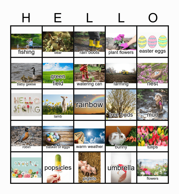 This bingo card has 33 images and 31 words: flowers, tulips, lamb, chick, robin, green field, easter eggs, dear, garden soil, watering can, rain boots, rainbow, rain, tree buds, nest, popsicles, basket of eggs, bunny, warm weather, humming bird, fishing, mud, piglets, rainbow, plant flowers, farming, baby geese, tulips, gardening, umbrella and baseball.