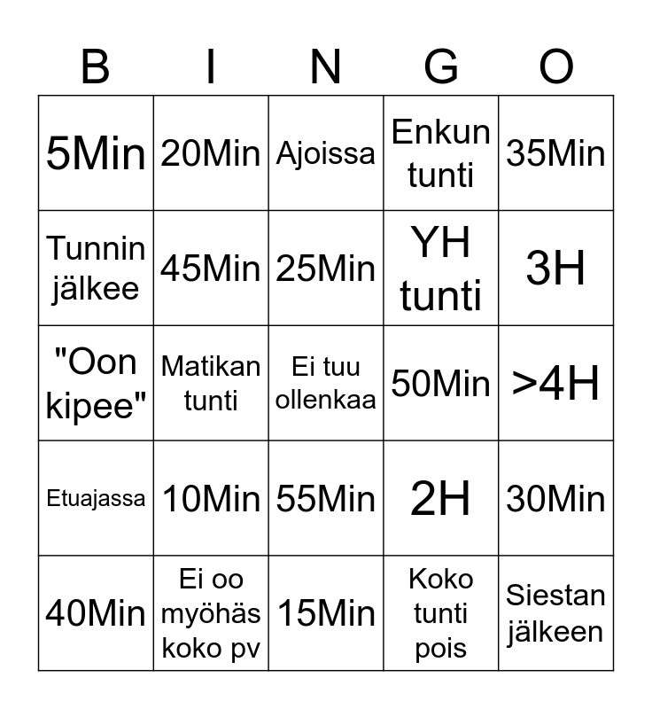 This bingo card has 25 words: 10Min, 15Min, 25Min, 40Min, 35Min, 5Min, Tunnin jälkee, 20Min, 50Min, 55Min, YH tunti, "Oon kipee", 2H, 30Min, 45Min, Siestan jälkeen, >4H, Ajoissa, 3H, Matikan tunti, Ei tuu ollenkaa, Ei oo myöhäs koko pv, Etuajassa, Enkun tunti and Koko tunti pois.