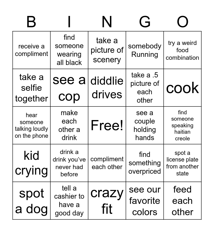 This bingo card has a free space and 24 words: drink a drink you’ve never had before, tell a cashier to have a good day, diddlie drives, spot a dog, try a weird food combination, receive a compliment, take a selfie together, find someone wearing all black, see a couple holding hands, compliment each other, take a .5 picture of each other, hear someone talking loudly on the phone, find something overpriced, spot a license plate from another state, see a cop, see our favorite colors, find someone speaking haitian creole, take a picture of scenery, cook, make each other a drink, feed each other, kid crying, somebody Running and crazy fit.