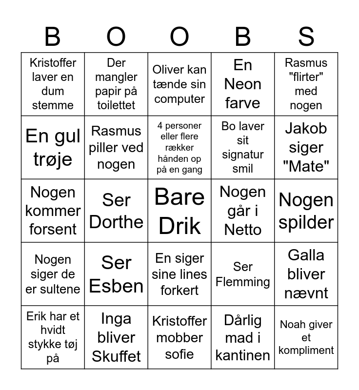This bingo card has a free space and 24 words: Ser Esben, Inga bliver Skuffet, 4 personer eller flere rækker hånden op på en gang, Erik har et hvidt stykke tøj på, Rasmus "flirter" med nogen, Kristoffer laver en dum stemme, En gul trøje, Der mangler papir på toilettet, Nogen går i Netto, En siger sine lines forkert, Bo laver sit signatur smil, Nogen kommer forsent, Ser Flemming, Galla bliver nævnt, Rasmus piller ved nogen, Dårlig mad i kantinen, Nogen spilder, Oliver kan tænde sin computer, Jakob siger "Mate", Ser Dorthe, Noah giver et kompliment, Nogen siger de er sultene, En Neon farve and Kristoffer mobber sofie.