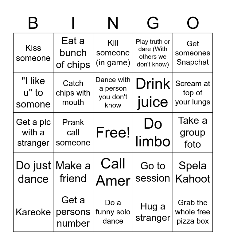 This bingo card has a free space and 24 words: Make a friend, Get a persons number, Dance with a person you don't know, Kareoke, Get someones Snapchat, Kiss someone, "I like u" to somone, Eat a bunch of chips, Do limbo, Call Amer, Drink juice, Get a pic with a stranger, Go to session, Spela Kahoot, Catch chips with mouth, Hug a stranger, Take a group foto, Kill someone (in game), Scream at top of your lungs, Prank call someone, Grab the whole free pizza box, Do just dance, Play truth or dare (With others we don't know) and Do a funny solo dance.