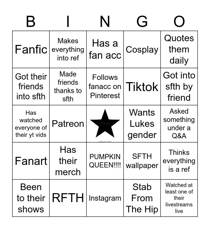 This bingo card has a free space and 24 words: Has their merch, RFTH, Follows fanacc on Pinterest, Been to their shows, Quotes them daily, Fanfic, Got their friends into sfth, Makes everything into ref, Wants Lukes gender, PUMPKIN QUEEN!!!!, Tiktok, Has watched everyone of their yt vids, SFTH wallpaper, Thinks everything is a ref, Made friends thanks to sfth, Stab From The Hip, Asked something under a Q&A, Has a fan acc, Got into sfth by friend, Patreon, Watched at least one of their livestreams live, Fanart, Cosplay and Instagram.